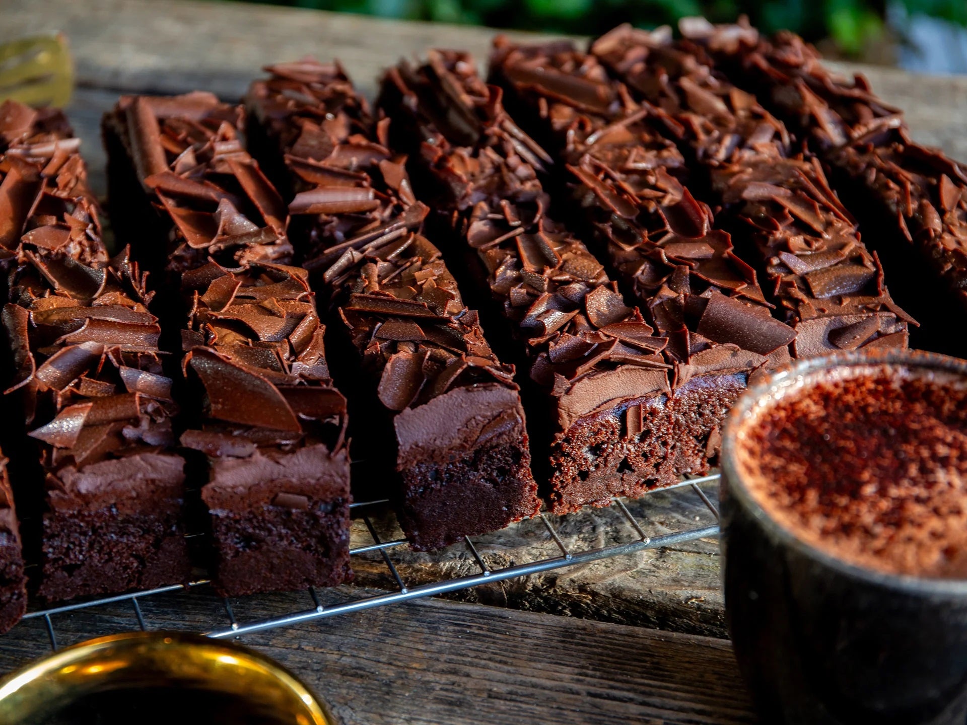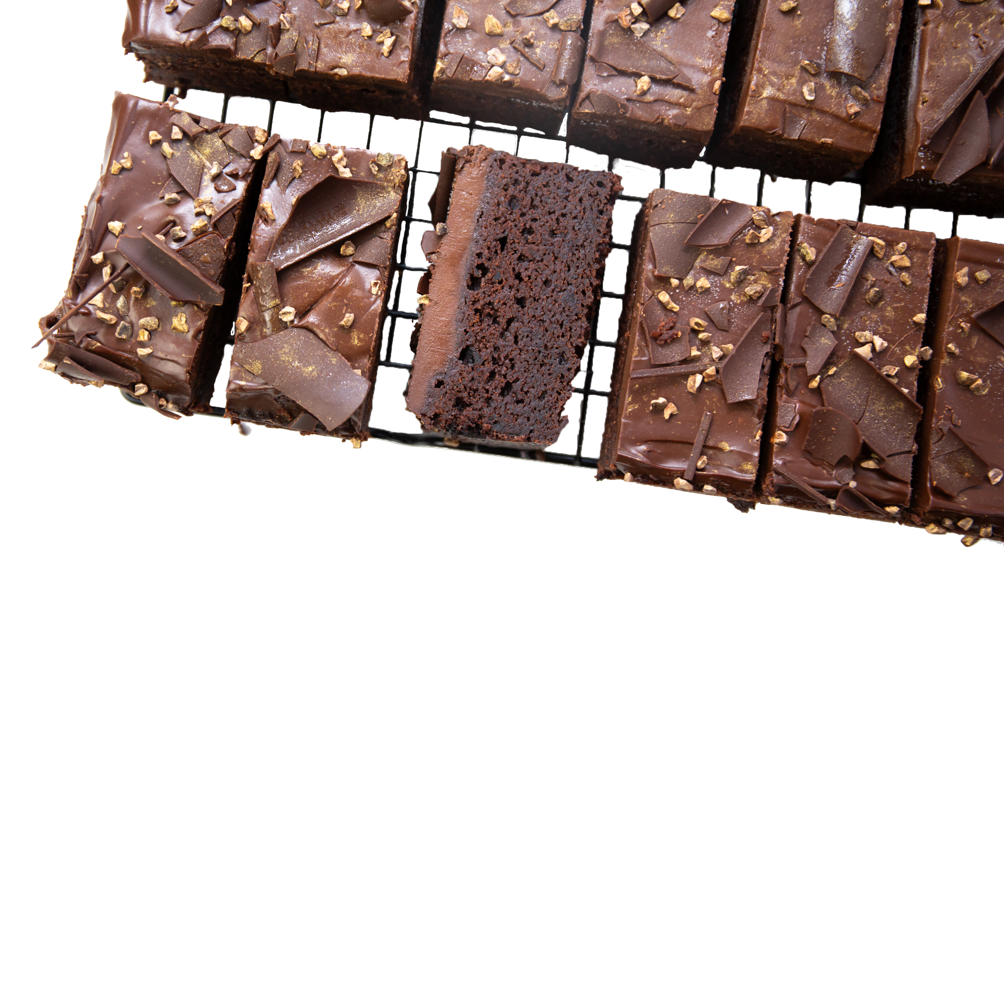 We hebben een rijke, smeuïge plantaardige chocoladesponge genomen en deze afgewerkt met een pure chocolateganache, een vleugje met goud bestoven cacaonibs en extra pure chocolade.