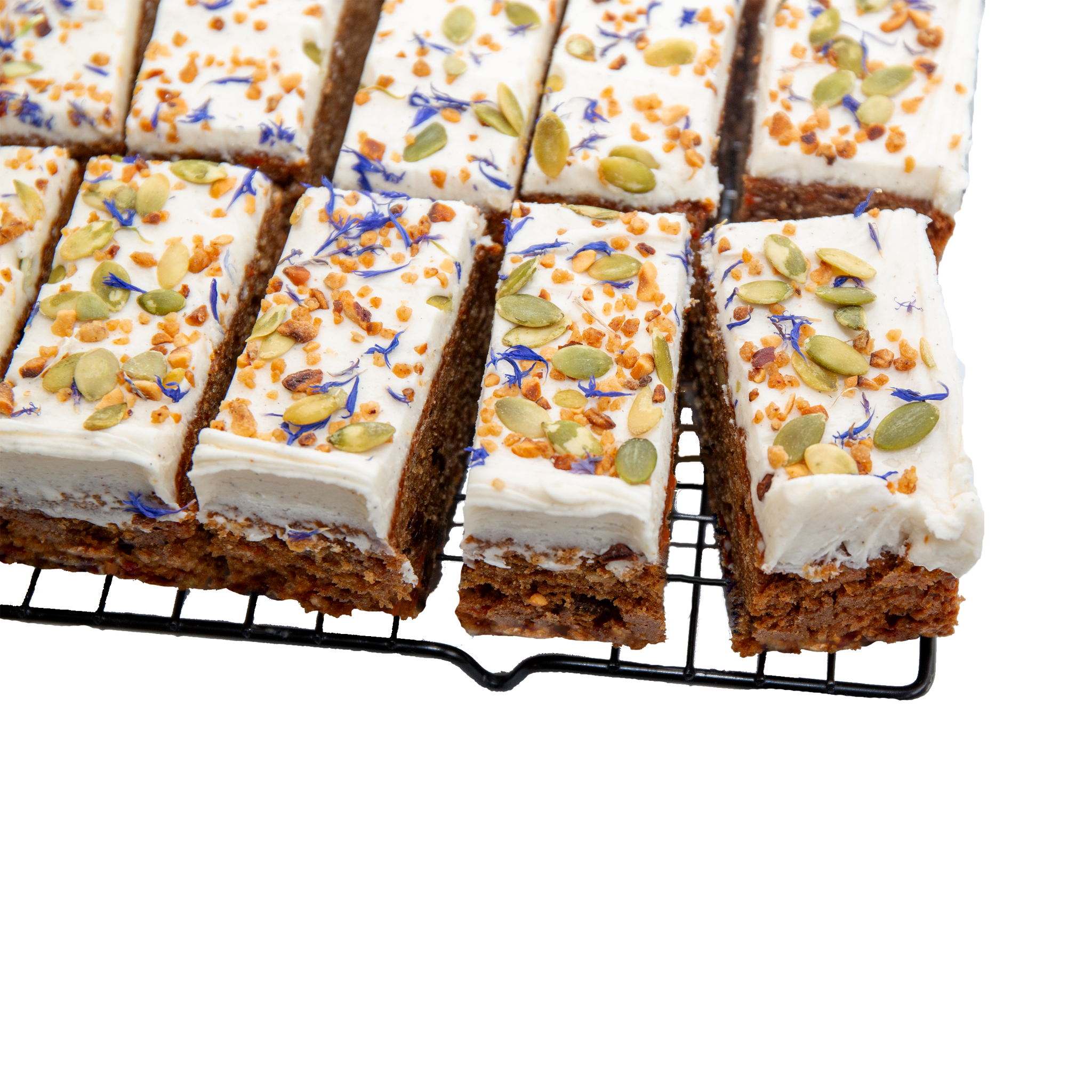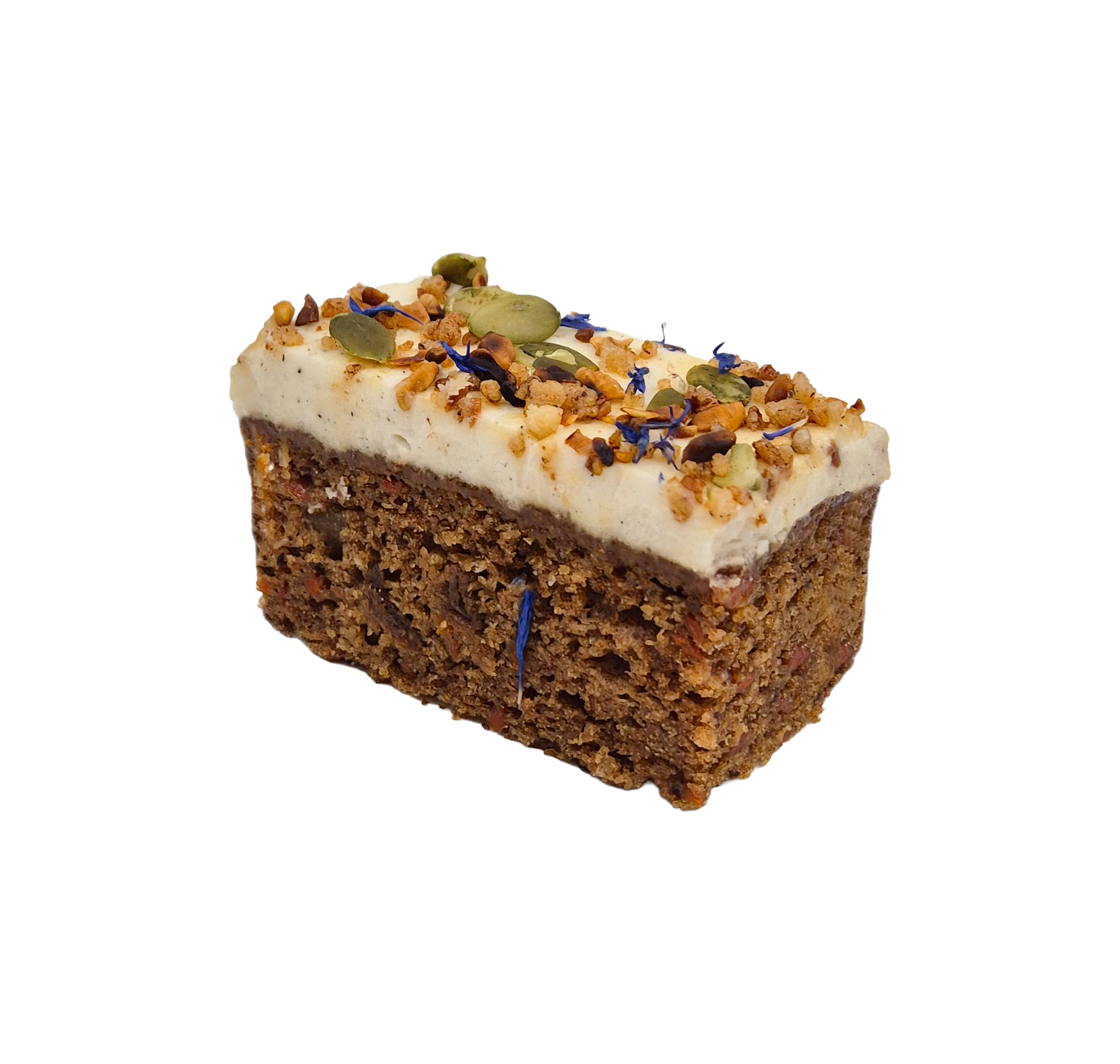 Een smeuïge, licht gekruide wortel- en sinaasappelsponge, boordevol sultana’s, kokos en walnoten. Afgewerkt met plantaardige roomkaas, korenbloemblaadjes, gekonfijte hazelnoten en pompoenpitten.