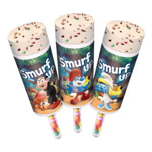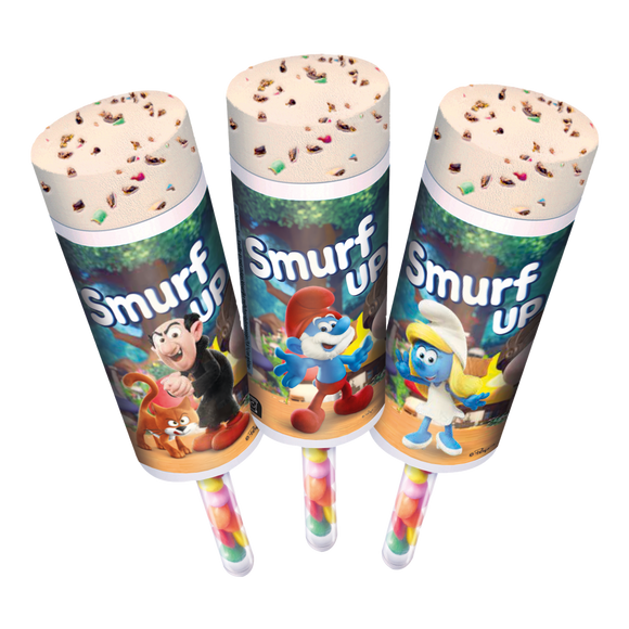 Vanille roomijs met stukjes smarties in handige kartonnen pop-up verpakking met plastic stokje gevuld met gekleurde smarties.