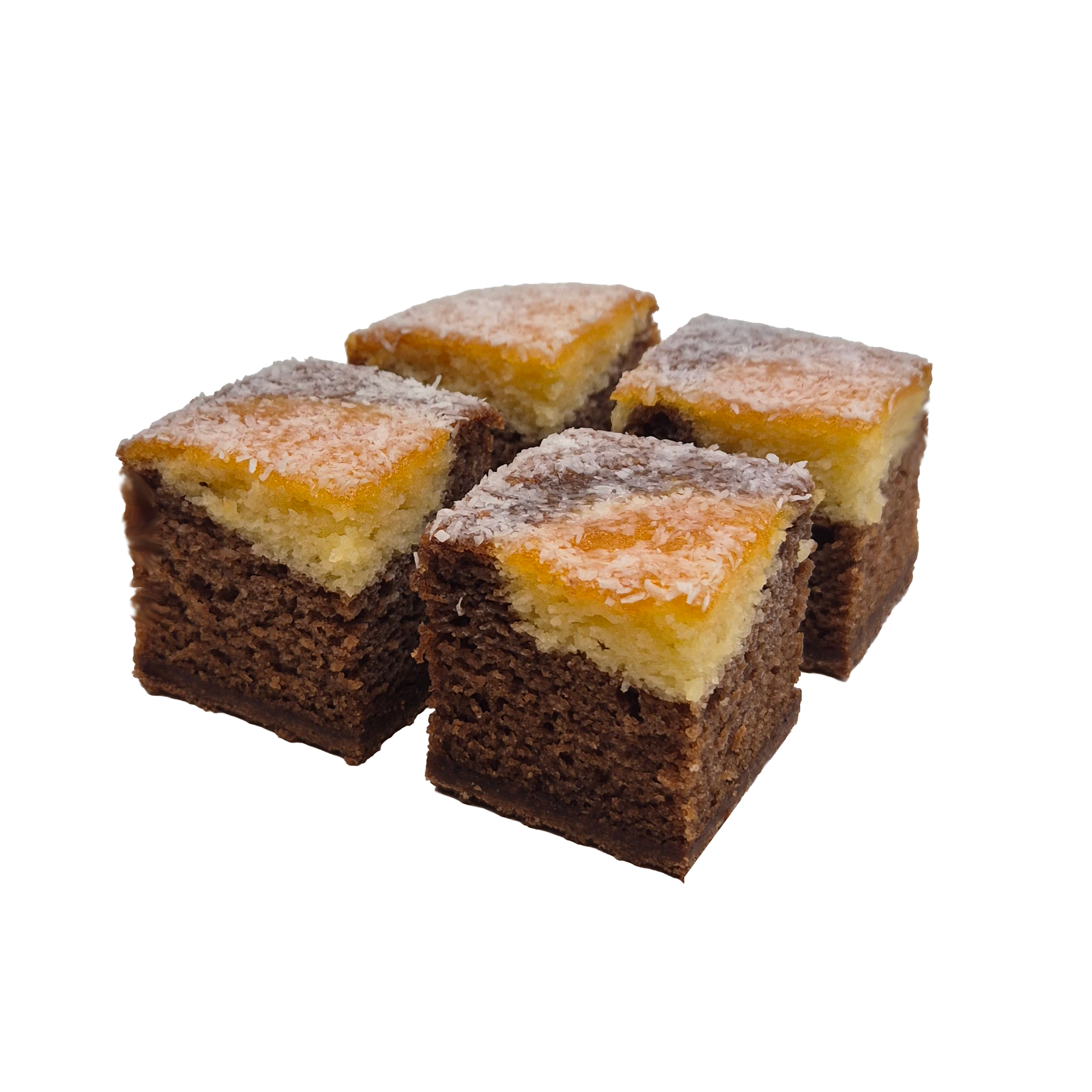 Luchtige chocolade en cocoscake voorzien van cocos schaafsel en een krokante bodem. Voorgesneden in stukjes van 4x4 cm