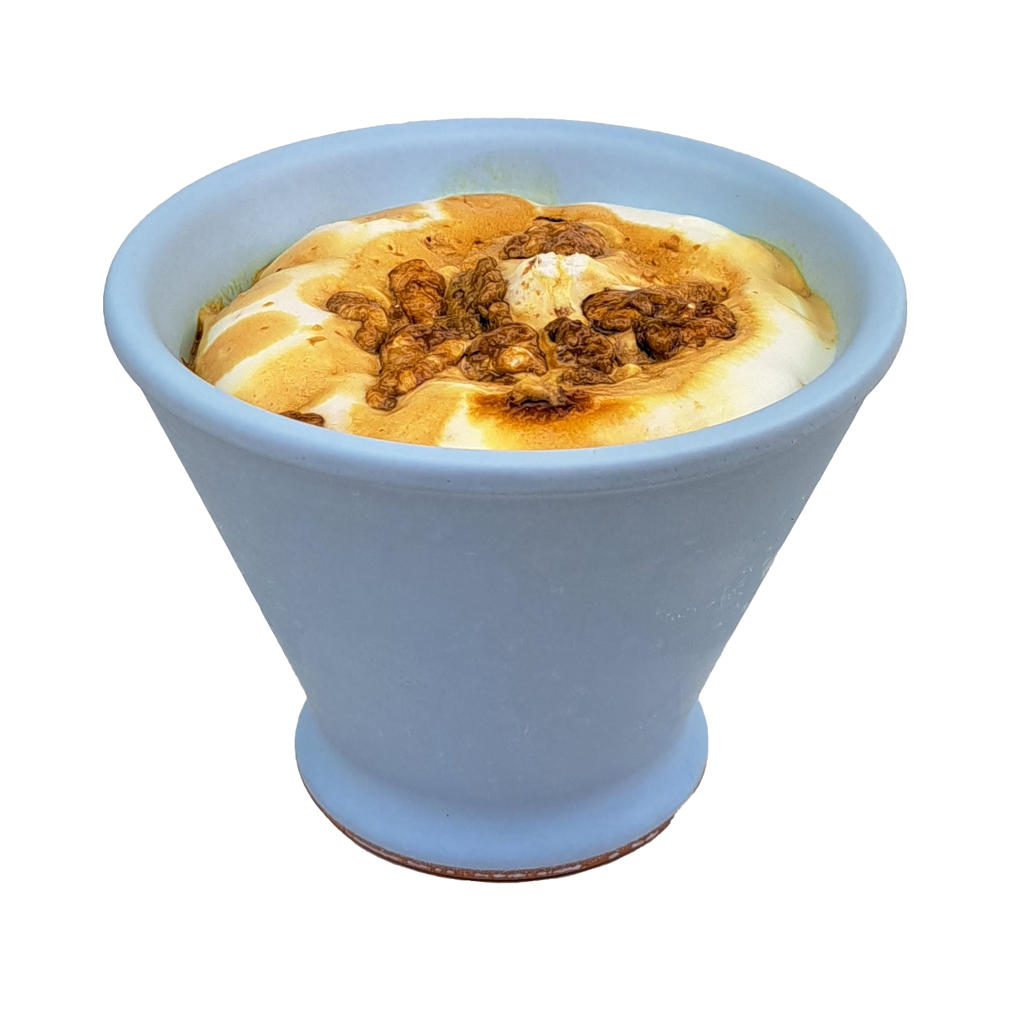 Keramiek schaaltje gevuld met ijs met vanillesmaak, stukjes walnoot, gekarameliseerde suiker en gesuikerde amandelen.