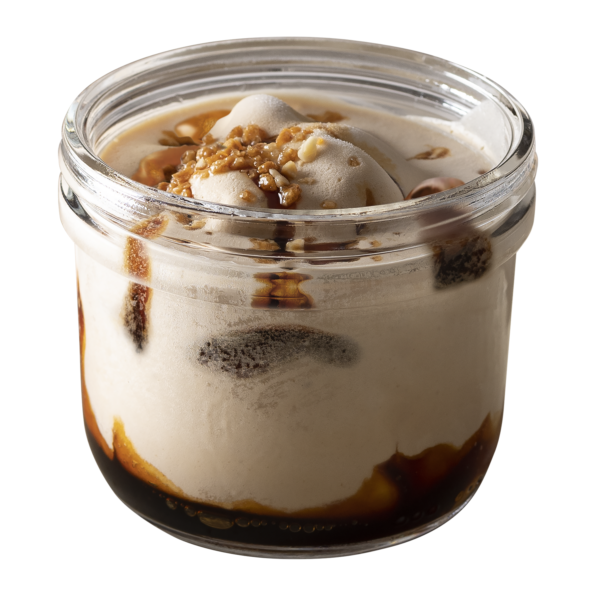 Glazen potje gevuld met nougatijs, karamelsaus en amandelstukjes.