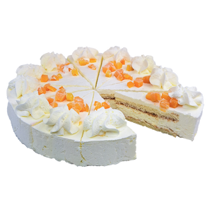 In 12 punten voorgesneden luxe Slagroomtaart. Luchtige laagjes kapsel gevuld met Slagroom. Afgetopt met stukjes perzik. Voorzien van een Toef slagroom en Chocolade schaafsel. Aan de zijkant is de taart aangezet met Chocolade schaafsel.