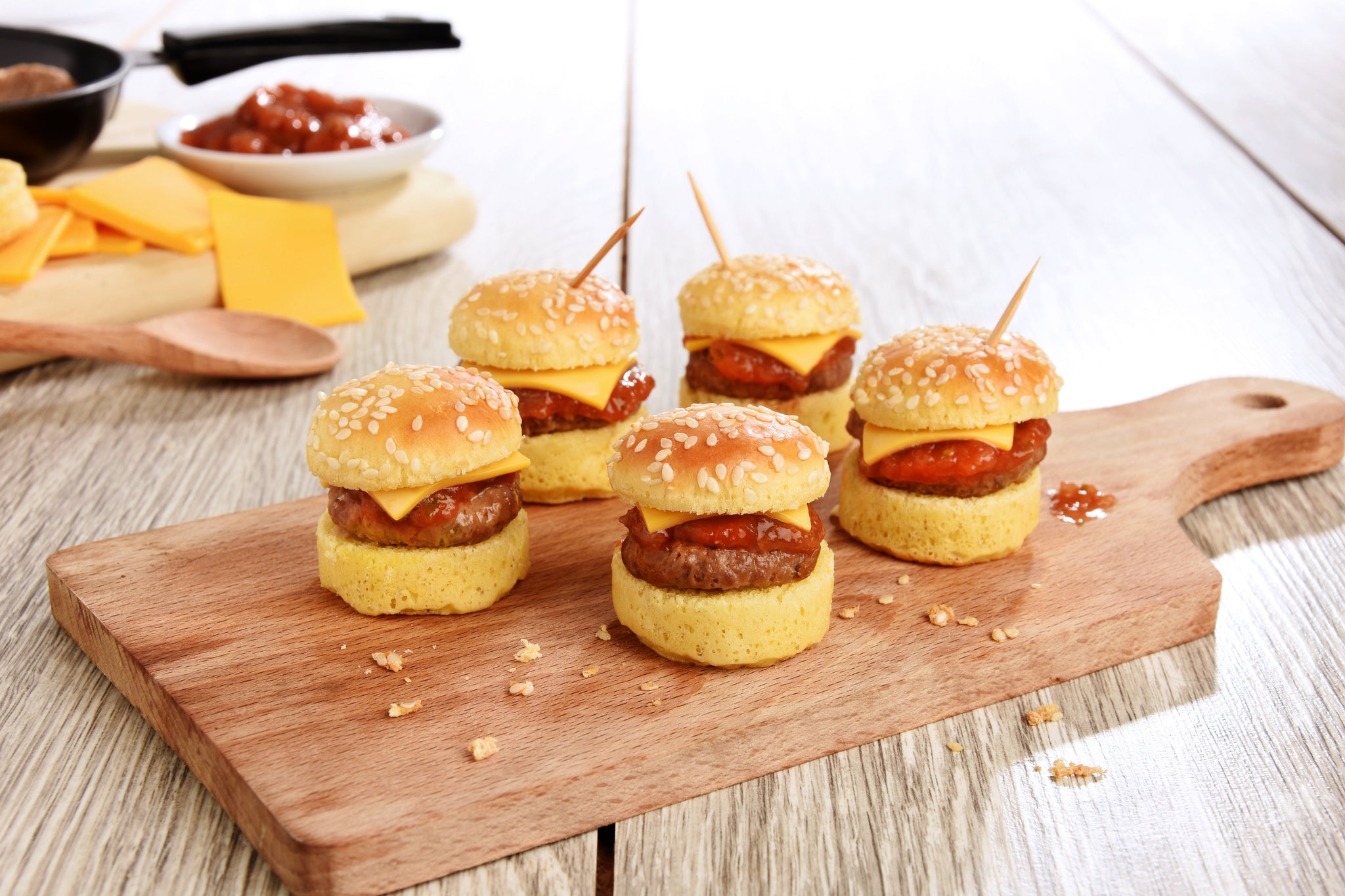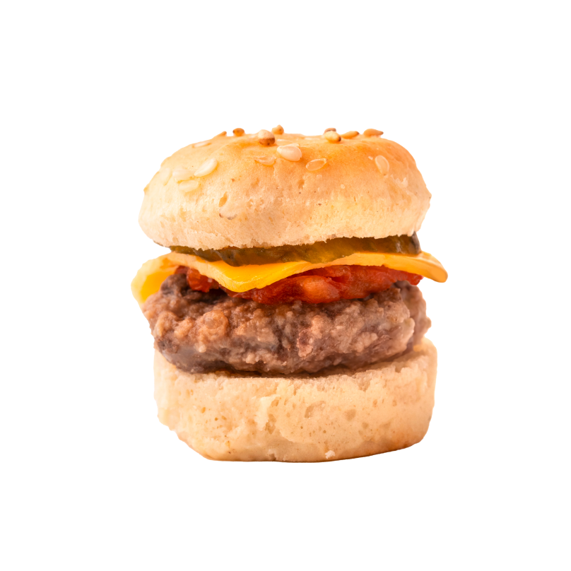Over deze cheeseburger hoef je je niet schuldig te voelen omdat hij lekker klein is. Dit sesambroodje is belegd met een hamburger, cheddarkaas, augurk, ui en ketchup. Perfect voor bij een high tea of borrel.