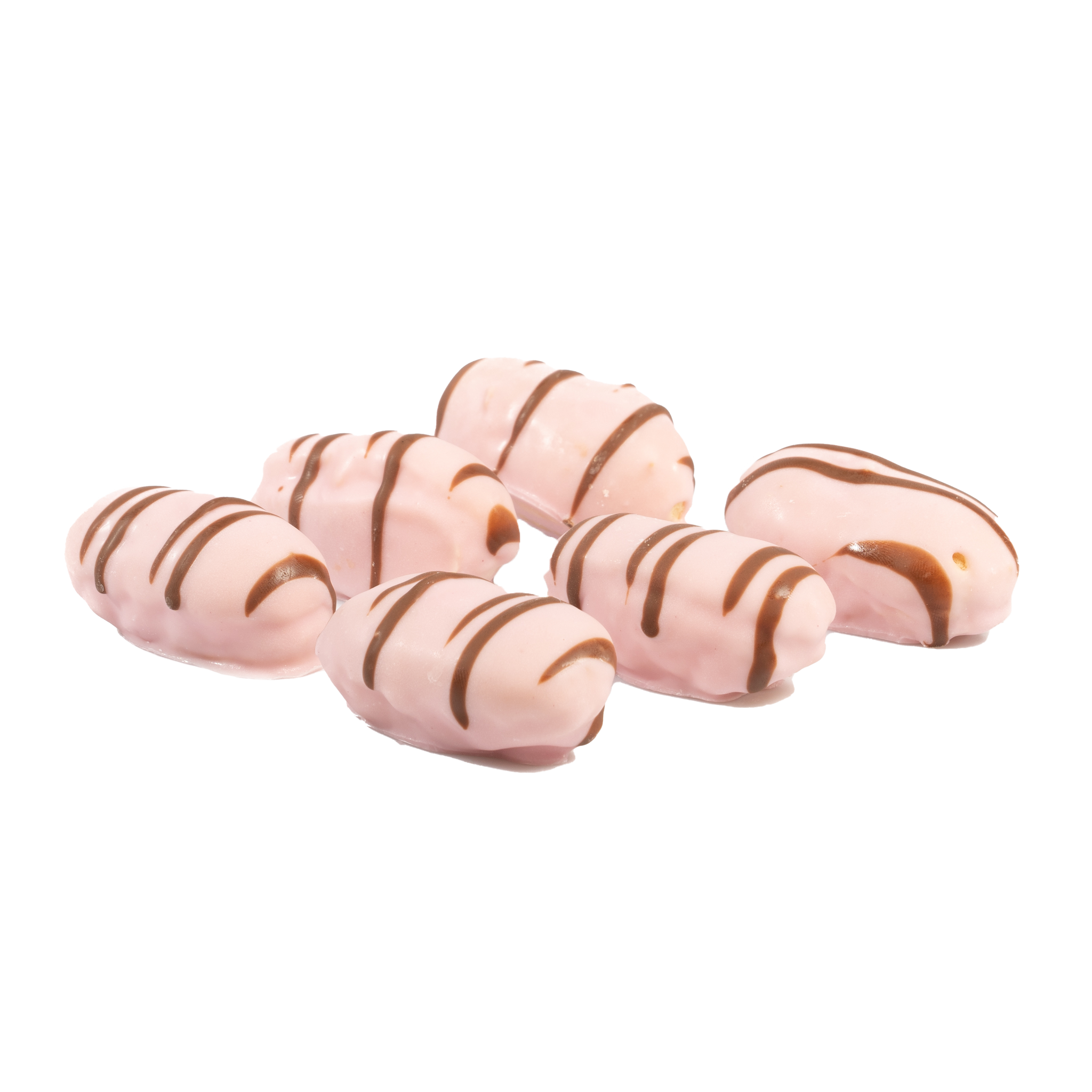 Mini eclair gevuld met gele room. Overgoten met roze glace en streepjes chocolade.